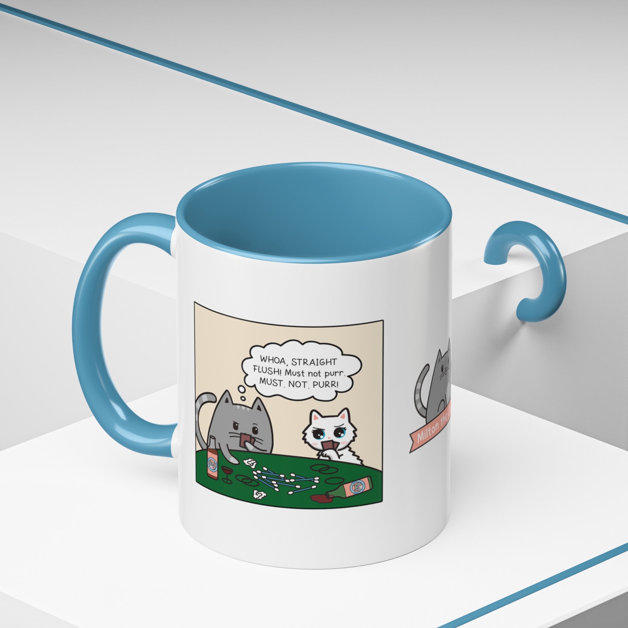 The Cat Poker Comic Mug is available in the following options: 11oz / Navy, 11oz / Pink, 11oz / Light Blue. Check the product page for current stock availability.