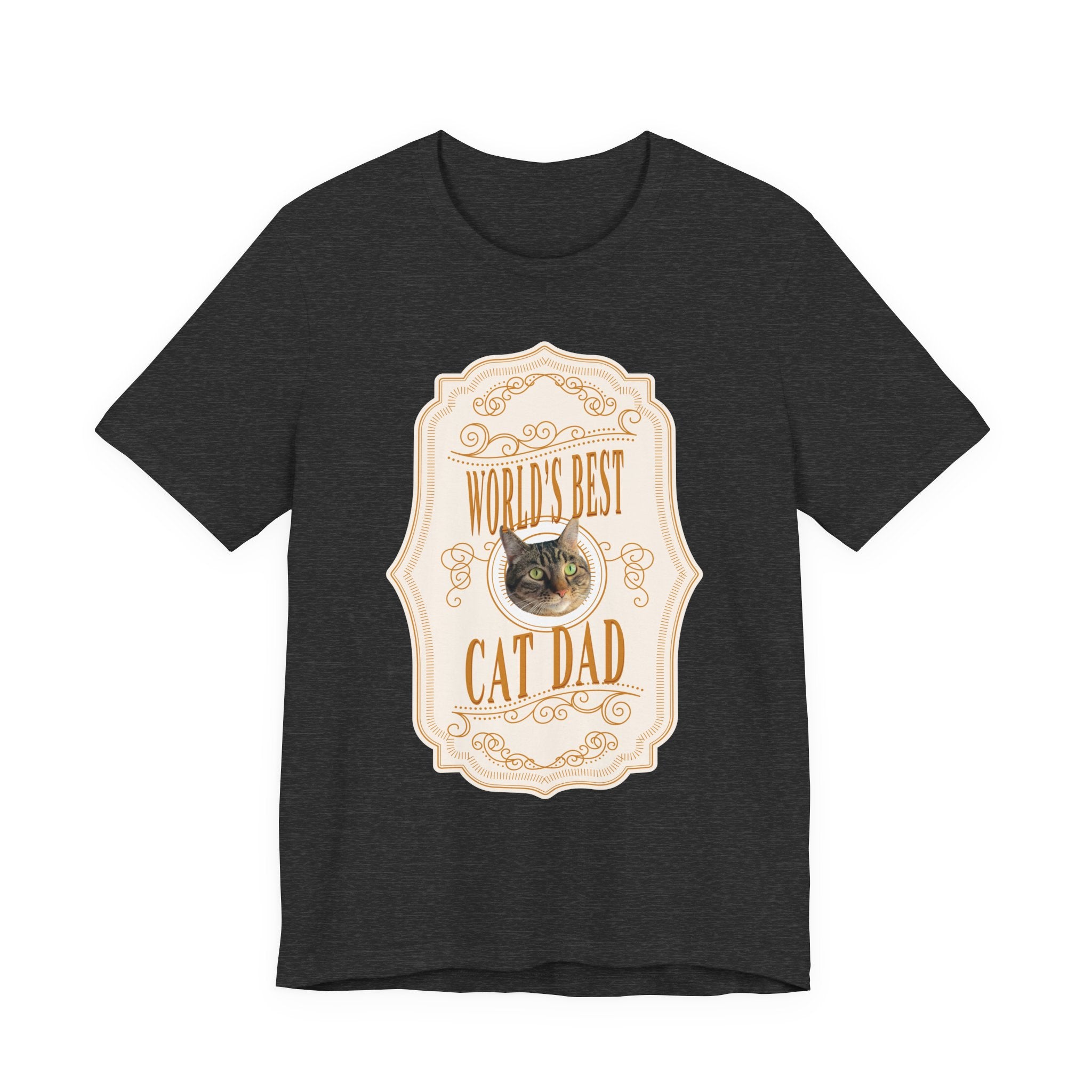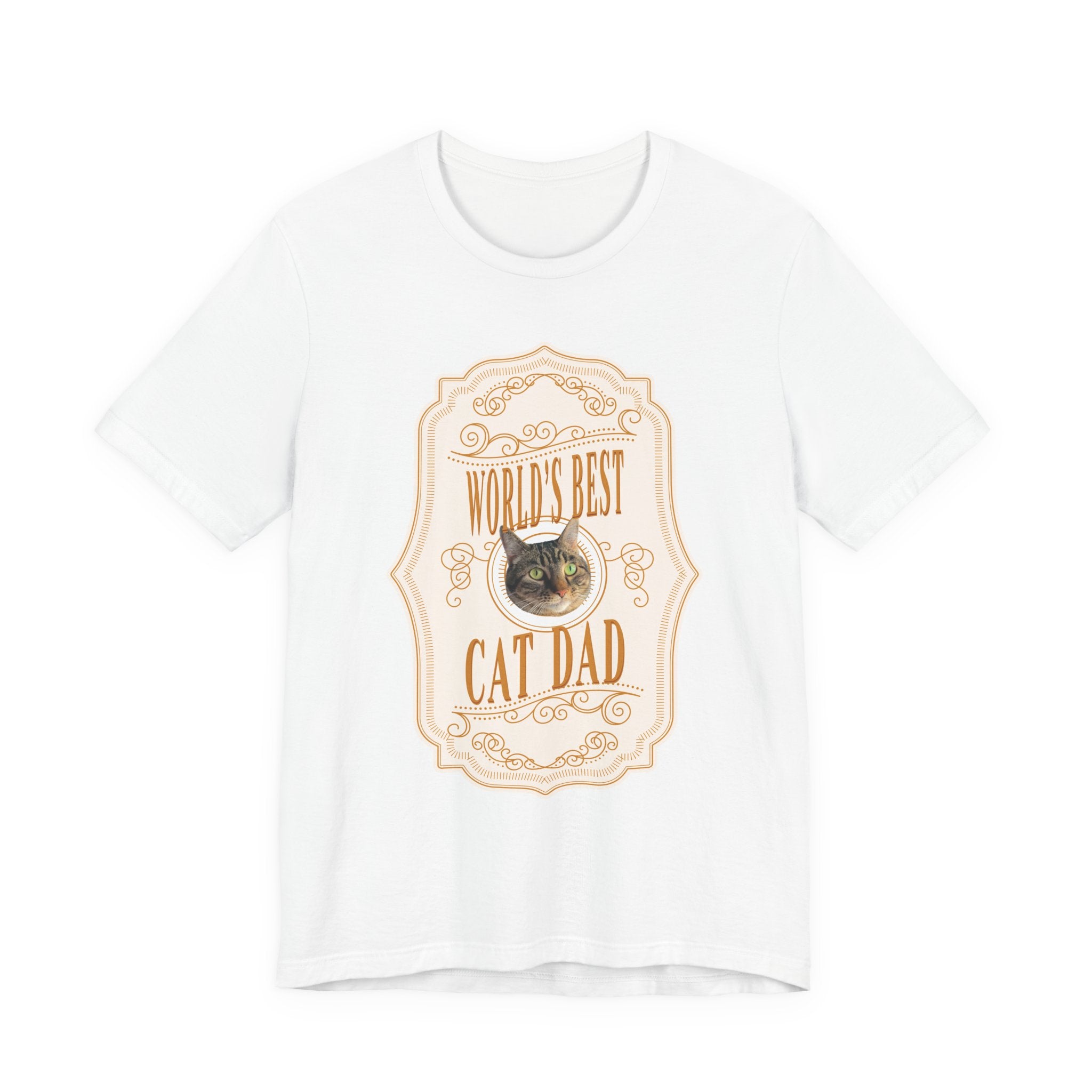 On the prowl for a one-of-a-kind gift that will make your favorite cat dad purr with pride? Look no further. The Custom “World's Best Cat Dad” Whiskey Label T-Shirt turns their beloved kitty into the star of a bold whiskey label inspired design. Each shirt is custom printed with your cat’s adorable face, surrounded by the playful phrase “World's Best Cat Dad.”
