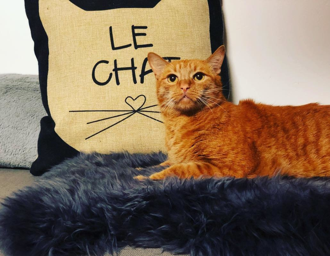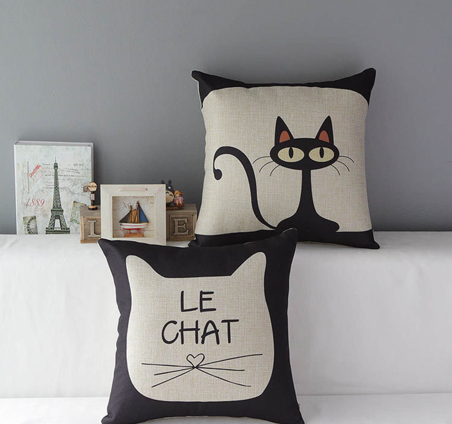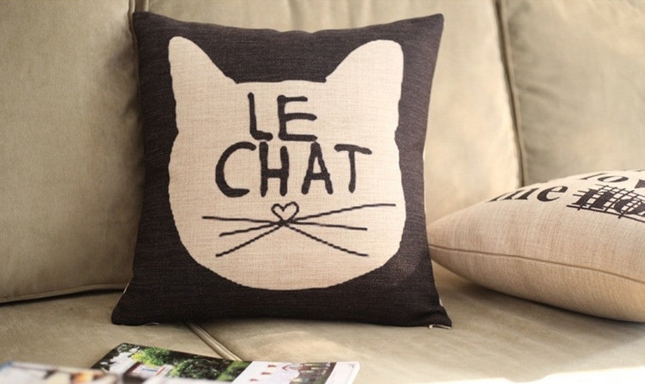 This cute toss pillow is off-white and black, with "Le Chat" printed on it. Although this little kitty is French - she still pronounces it "Meow". Whether you are looking to decorate your living room or bedroom, this pillow is a great way to add a little character to your furniture. What better way for us cat lovers to announce how much we love our furry little friends. Cozy up with your cat and rest your head on this comfy headrest.