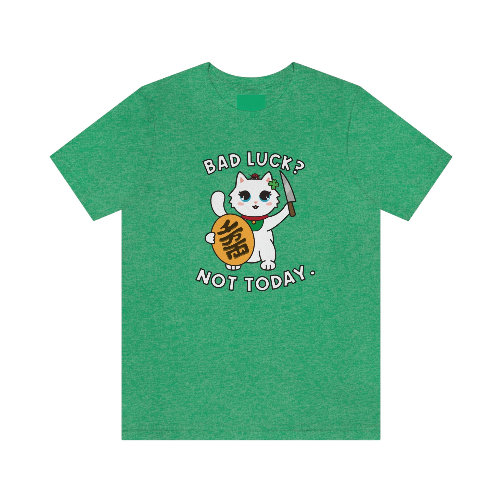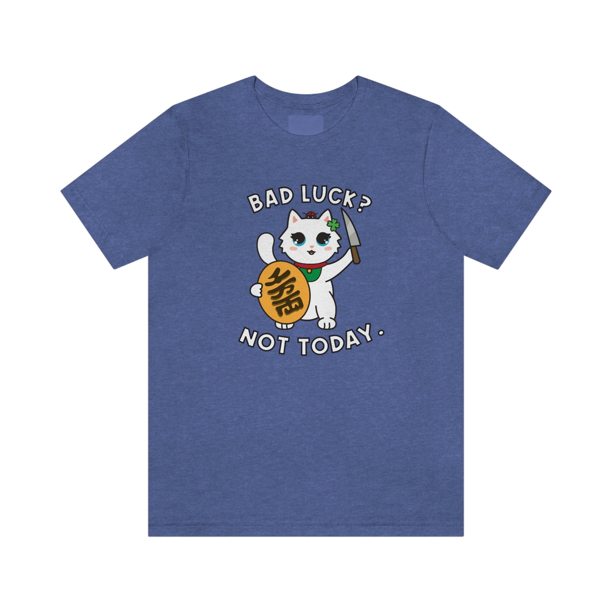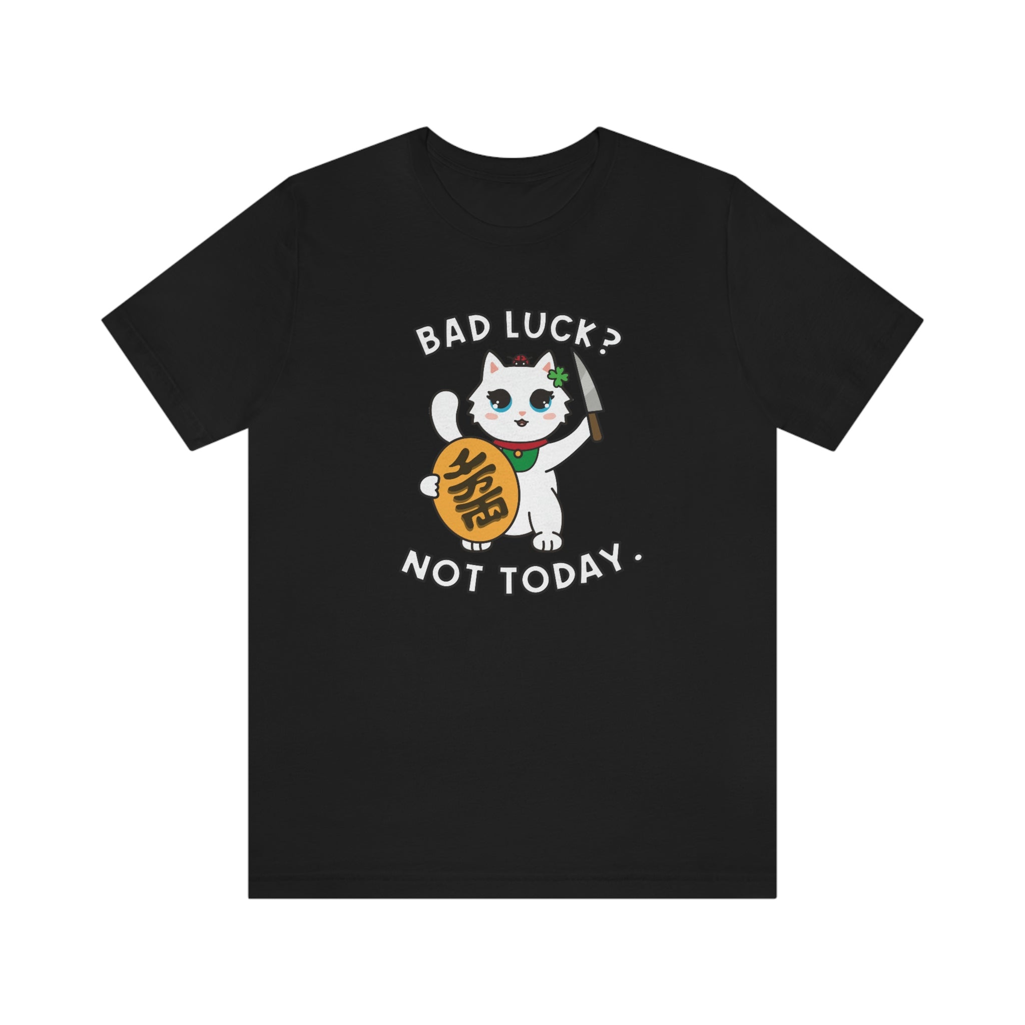 Introducing our newest addition to our collection of unisex t-shirts, featuring the co-star of our Milton the Cat webcomic, Millie, dressed as a Maneki Neko cat. Maneki Neko, also known as the "Lucky Cat," is thought to bring good luck and fortune to its owner. Our Maneki Millie is going the extra mile by sporting other symbols of good luck, from ladybugs to four-leaf clovers. And if that doesn’t do the trick of warding off bad luck? Millie has her signature knife in paw ready to tell bad luck, “Not today.”