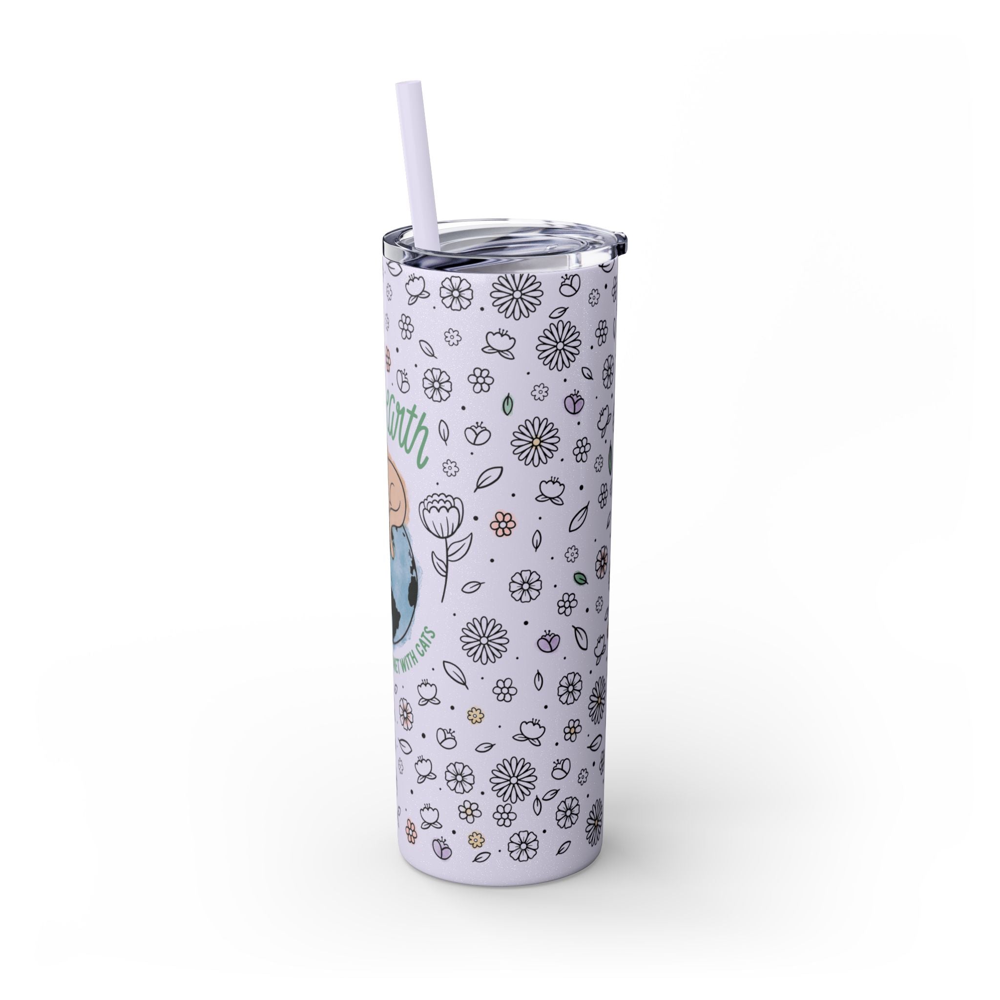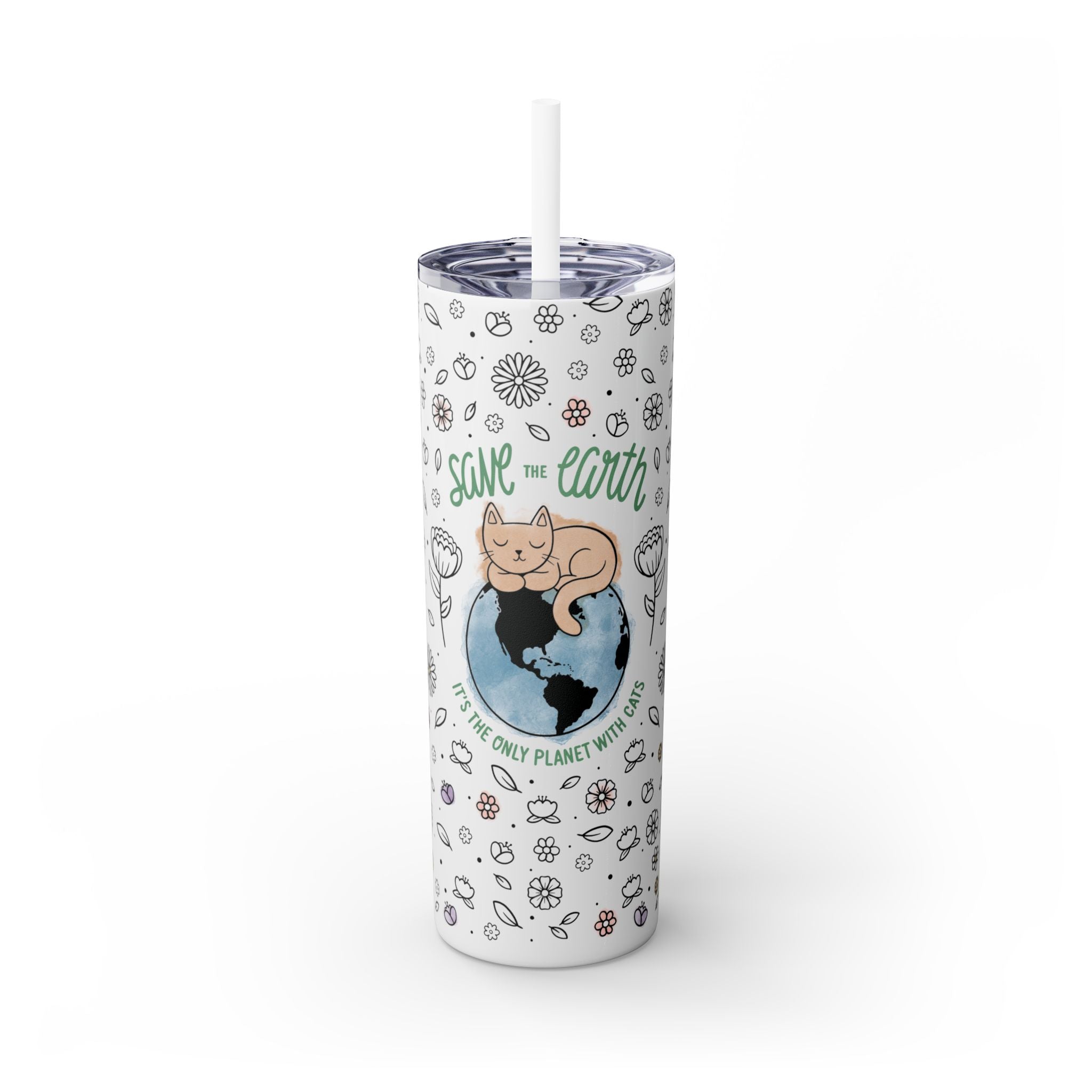 This reusable stainless steel tumbler features our signature quote, “Save the Earth: It’s the Only Planet with Cats,” set against a whimsical floral pattern and soft pastel watercolor accents. The glossy glitter finish adds a sparkling touch that catches the light and turns heads wherever you go.