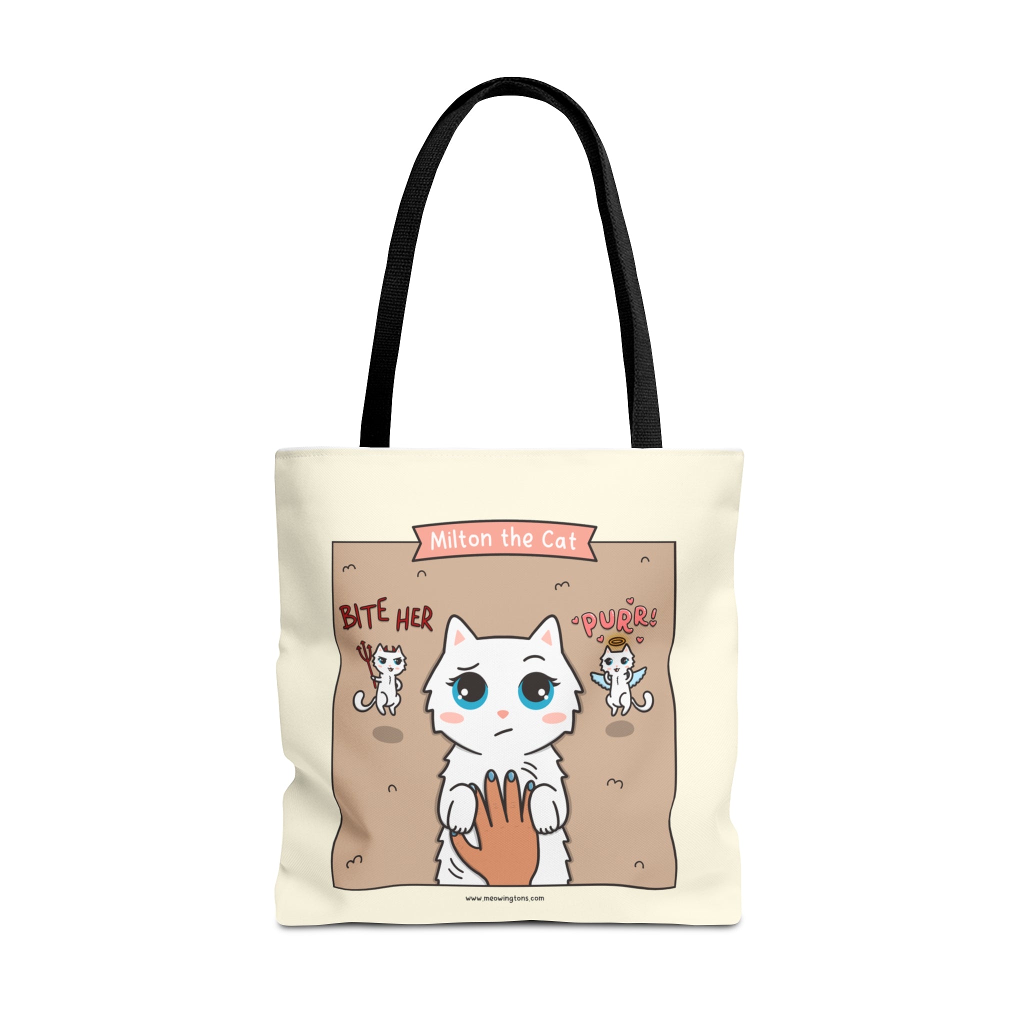 Our Tummy Rubs Trap Comic Tote Bag is a must-have from our Milton the Cat Comic Collection! Featuring our beloved sassy tabby and his charming sidekick, Millie, these playful felines steal the spotlight in our webcomic, Milton the Cat. Crafted from durable polyester with reinforced handles, this tote combines style and functionality effortlessly, making it perfect for all your carrying needs.