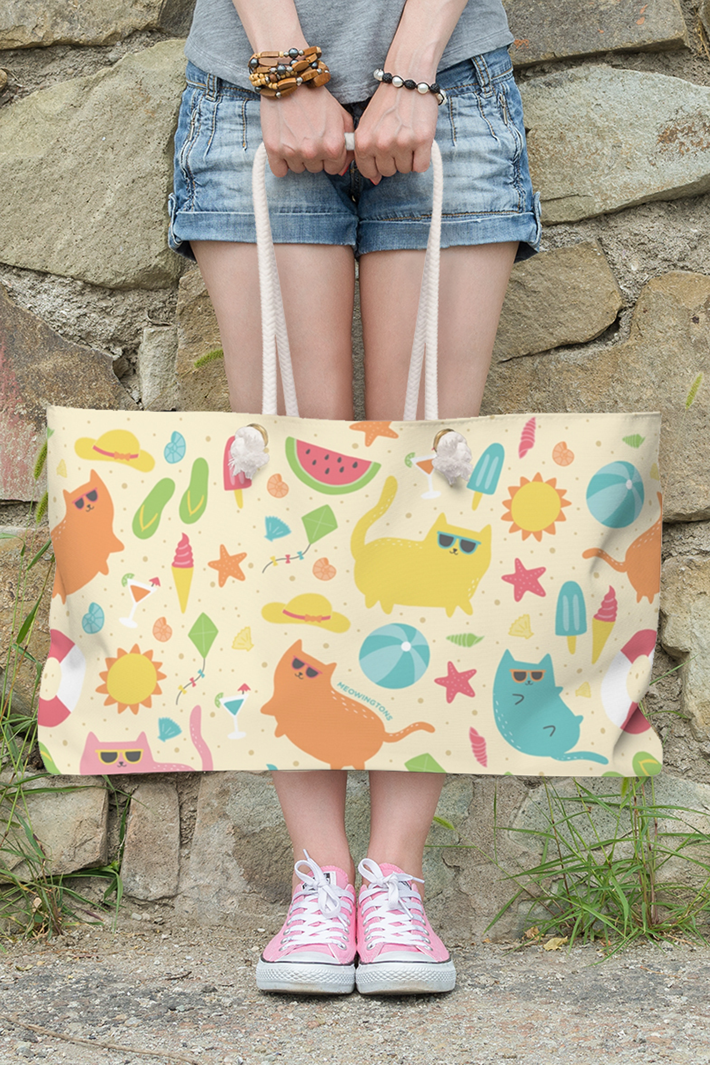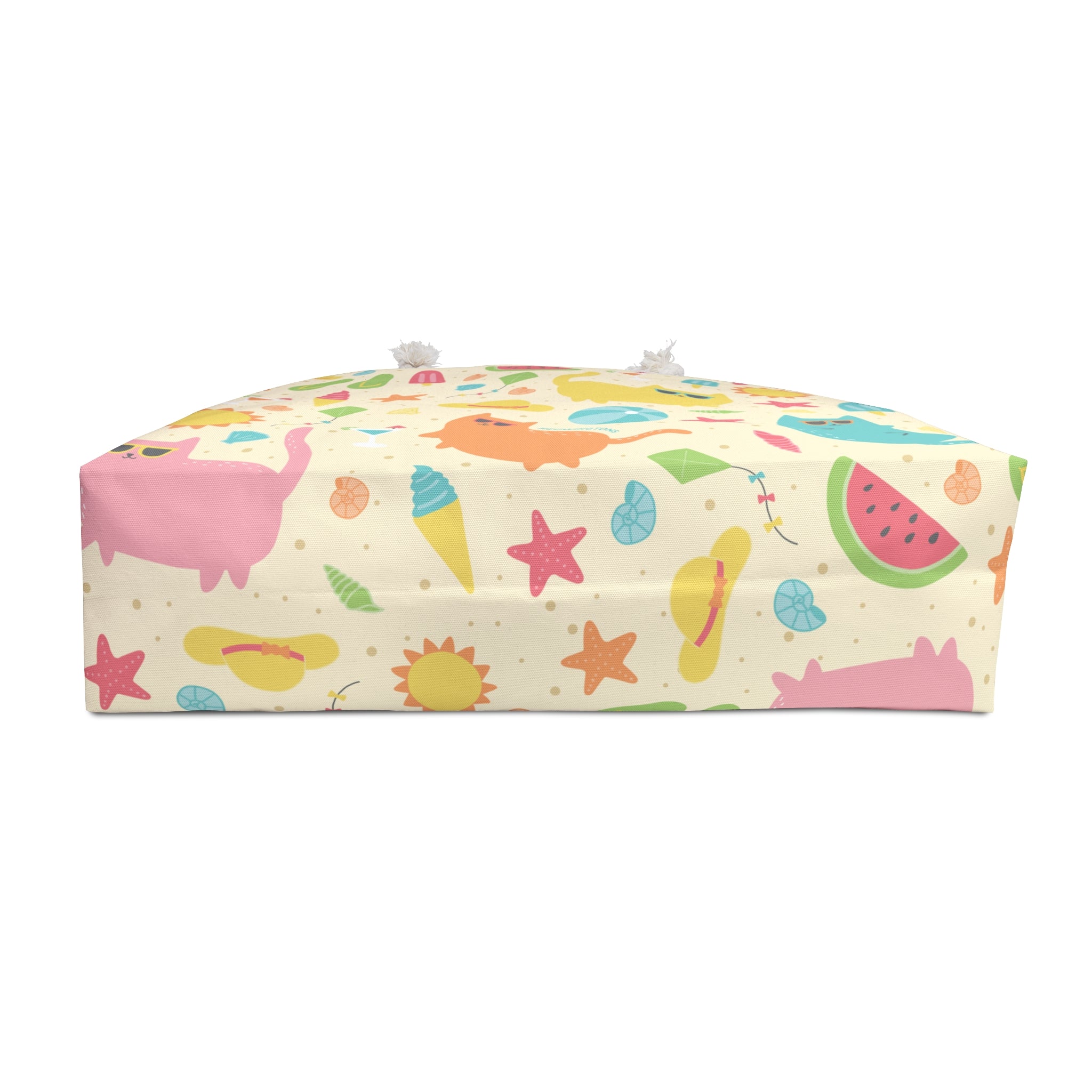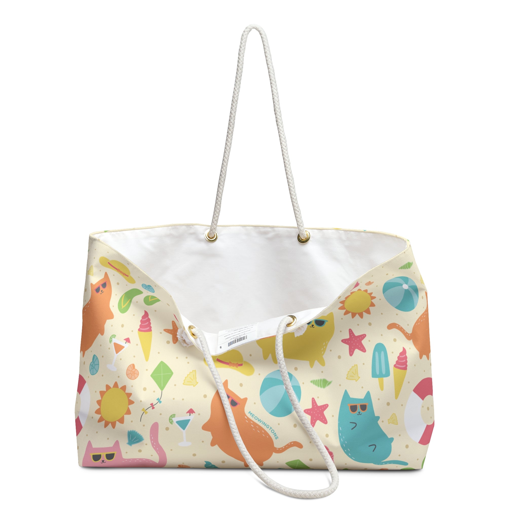 With its bright, multicolor cat print and knotted cotton rope handles, this open-top Weekender Beach Tote Bag will have you feline fine all summer long! Whether you're headed to the beachside or the poolside, this cute cat tote bag is large enough to hold all your summer essentials.